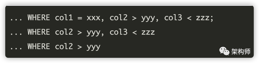 如果一个表有一个组合索引,那么任何符合**最左匹配原则**的查询条件都会触发优化器使用该索引进行数据查找。比如,有一个三列的组合索引(col1, col2, col3),那么当查询:where col1=xxx 、where col1=xxx and col2=xxx、where col1=xxx and col2=xxx and col3=xxx时,都会触发该索引。